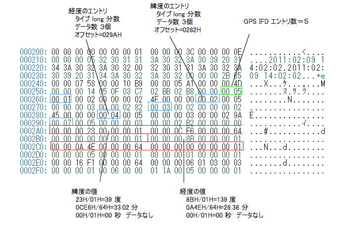 あれば、そのエントリの最終4バイトがGPS IFD へのオフセット(上例では 0240H)を取得する。
