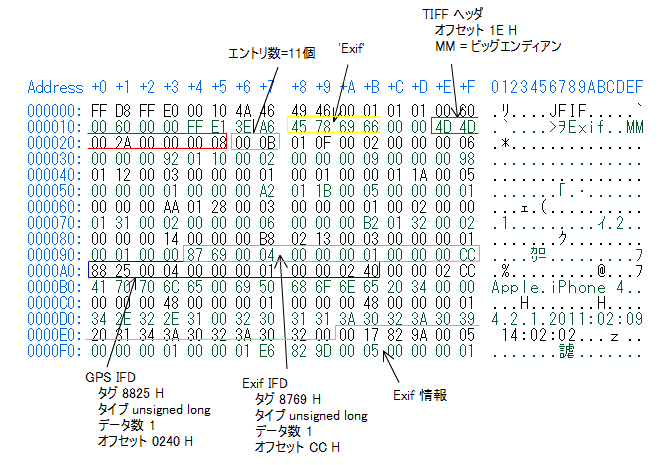 あれば、そのエントリの最終4バイトがGPS IFD へのオフセット(上例では 0240H)を取得する。