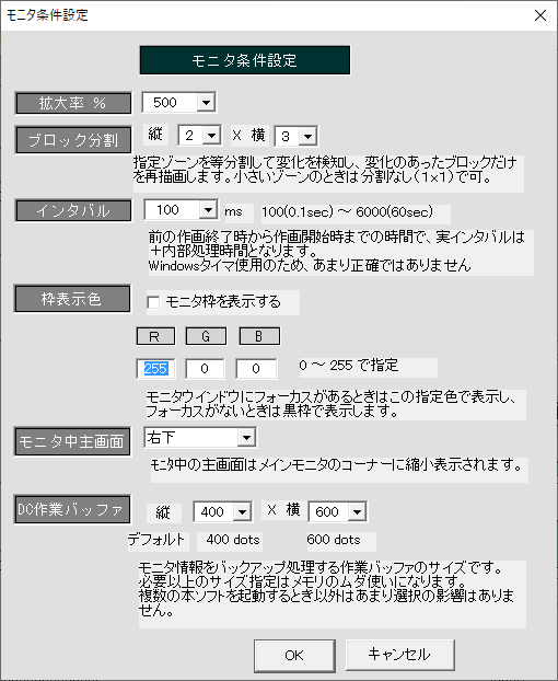 インタバル、ブロック分割、拡大%、枠作画色、モニタ中の主画面位置等の条件を指定します。詳細は後述。