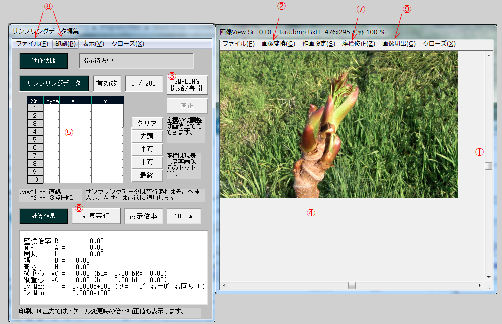 「計算実行」ボタンをクリックすると、計算結果を下段に表示し、画像Viewer上では、点列間を直線もしくは3点円弧で結びます。