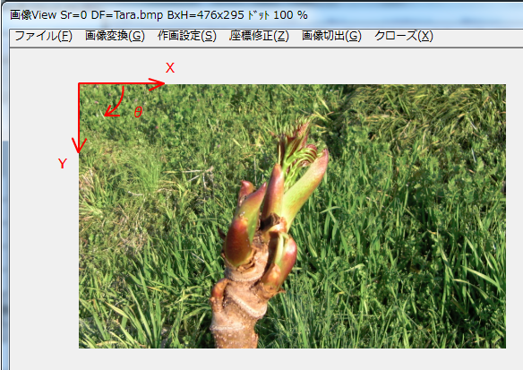 画像の左上端を原点とし、右方向がx軸、下方向がy軸で、x軸から時計回りに回転角度θを定めています。